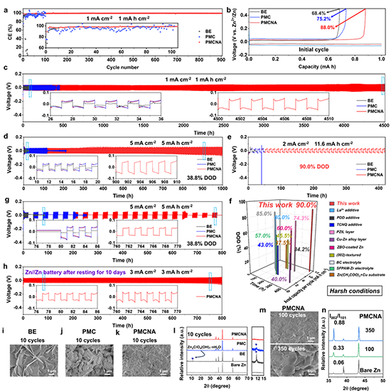 鋅基儲能系統(tǒng)由于其固有的安全性、低成本以及鋅金屬負(fù)極(高理論容量、低氧化還原電位和豐富儲量)的優(yōu)點(diǎn),已被認(rèn)為是電網(wǎng)規(guī)模儲能系統(tǒng)的合適候選者。然而,鋅金屬表面寄生副反應(yīng)及枝晶生長嚴(yán)重限制了其循環(huán)壽命和穩(wěn)定性。當(dāng)進(jìn)一步應(yīng)用于高鋅利用率、低N/P比和間歇條件等實(shí)際場景時,副反應(yīng)影響更加顯著,嚴(yán)重阻礙了鋅基儲能系統(tǒng)的商業(yè)化進(jìn)程。構(gòu)筑穩(wěn)定的電極/電解質(zhì)界面是一種有效抑制副反應(yīng)的策略。然而,目前開發(fā)策略過程相對繁瑣,存在添加劑易分解導(dǎo)致副反應(yīng)抑制不足的風(fēng)險。因此,探索簡單有效的方法實(shí)現(xiàn)高利用率的鋅金屬負(fù)極具有重要意義。