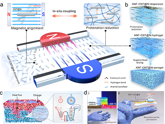 近日,王雙飛院士團(tuán)隊(duì)通過(guò)原位耦合磁對(duì)準(zhǔn)和質(zhì)子化還原的策略構(gòu)筑了一種可控各向異性結(jié)構(gòu)的芳綸摩擦電氣凝膠。該氣凝膠取向結(jié)構(gòu)的擬合度最高達(dá)到98%,合理的取向結(jié)構(gòu)使氣凝膠在300°C時(shí)表面電荷密度達(dá)到75 μC m-2。芳綸纖維的高溫?zé)岱(wěn)定性與自供電傳感的結(jié)合為設(shè)計(jì)耐高溫的多功能可穿戴傳感器提供了參考。這項(xiàng)成果以題為《Tunable Anisotropic Structural Aramid Triboelectric Aerogels Enabled by Magnetic Manipulation》發(fā)表在《Advanced Functional Materials》上。
