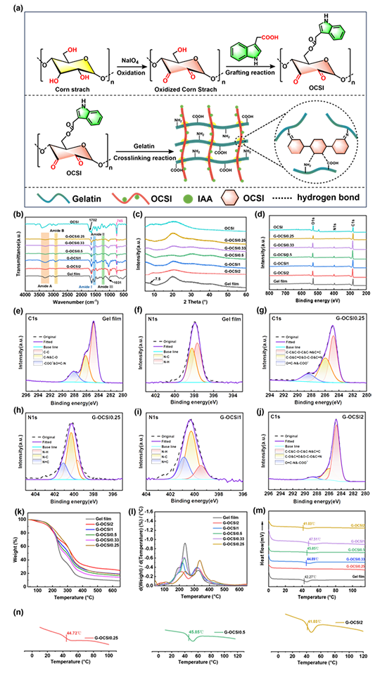圖2 G-OCSI的合成路線示意圖(a),傅立葉變換紅外光譜(b),XRD光譜(c),XPS全譜和高分辨率XPS C 1s和N 1s光譜(d-j),Gel膜和G-OCSI的TGA曲線(k),DTG曲線(l)和DSC曲線(m),以及G-OCSI0.25、G-OCSI0.5和G-OCSI2的DSC曲線(n)。