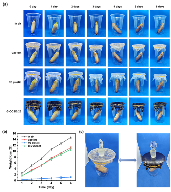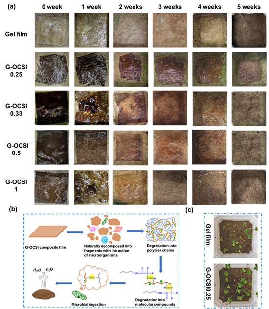 圖4 不同間隔時(shí)間的Gel膜和G-OCSI的生物降解圖像(a);天然土壤中G-OCSI的生物降解機(jī)制(b);油菜種子在Gel膜和G-OCSI0.25降解后土壤中的生長圖像(c)。