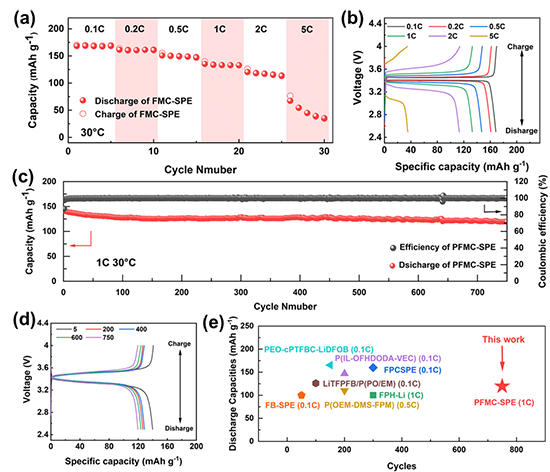 圖5 電池性能 a)PFMC-SPE倍率性能。b) 不同倍率下Li/PFMC-SPE/LFP電池在30 ℃下循環(huán)的電壓曲線。c)Li/PFMC-SPE/LFP電池在30℃下1.0C時的放電比容量和庫侖效率。d) 不同循環(huán)圈數(shù)下Li/PFMC-SPE/LFP電池在30 ℃下循環(huán)的電壓曲線。e) 相似氟化體系循環(huán)性能對比。