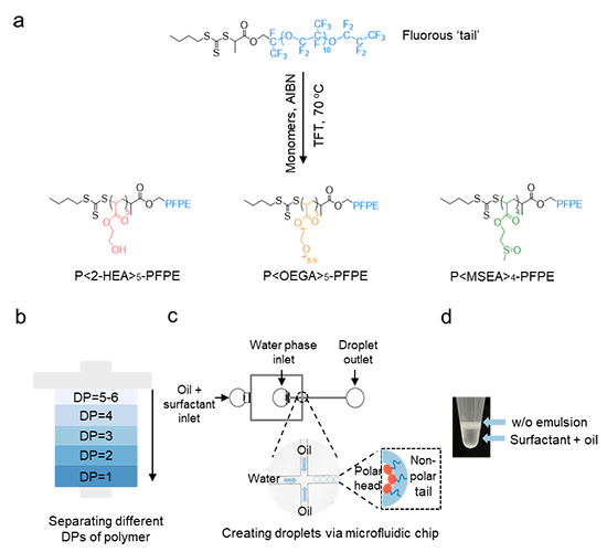 圖1. 使用 RAFT 聚合合成含氟表面活性劑。a) 合成含2-HEA、MSEA和OEGA的含氟表面活性劑PFPE 聚合物。b) 將鏈分布不均勻的母體 PFPE 聚合物通過快速色譜分離成不同成分的不同組分 c)用于生成油包水液滴的聚二甲基硅氧烷(PDMS)微流體裝置的示意圖。d)使用P <2-HEA>5-PFPE表面活性劑生成的油包水液滴。