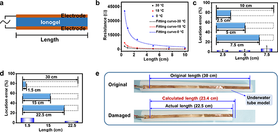 圖4. 水下?lián)p傷定位。(a)基于SIG的水下?lián)p傷定位裝置示意圖;(b)不同水溫不同長(zhǎng)度下基于SIG損傷定位器件的阻值;(c,d)初始長(zhǎng)度為10 cm(c)和30 cm(d)的基于SIG的水下裝置對(duì)不同損傷位置的定位誤差;(e)基于SIG器件水下?lián)p傷位置的圖片