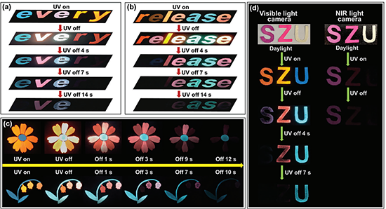 最后,鑒于以上這些摻雜PVA聚合物體系具有良好的水溶性、多彩長余輝和持久近紅外發(fā)光特性,作者設計了多種加密模板展示了它們在多重防偽加密和信息安全技術中的應用潛力。