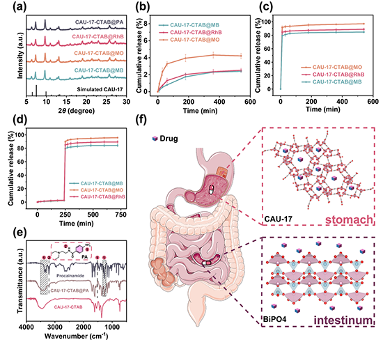 5. CAU-17-CTAB的藥物釋放行為 (a) CAU-17-CTAB吸附染料(MBRhBMO)PA后的PXRD圖譜。(b) pH=2.0時(shí),CAU-17-CTAB@dye在鹽酸水溶液中的藥物釋放曲線。(c) pH=7.4時(shí),CAU-17-CTAB@dyePBS溶液中的藥物釋放曲線。(d) CAU-17-CTAB@dye先后pH=2.0的鹽酸水溶液中pH=7.4PBS溶液中8h的藥物釋放曲線。(e) CAU-17-CTABCAU-17-CTAB@PA和普魯卡因胺的FTIR譜。(f) CAU-17-CTAB在胃腸道的結(jié)構(gòu)變化和藥物釋放示意圖。