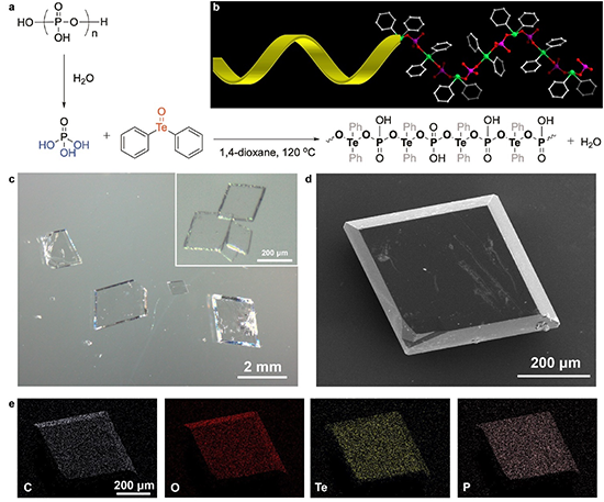 近日,香港城市大學張其春教授課題組通過將角型陰離子(HOPO32-)引入到傳統的線性碲氧鏈中,成功制備了一種新型無金屬螺旋共價非碳主鏈聚合物單晶({[Te(C6H5)2][PO3(OH)]}n,命名為CityU-10)。通過有機碲前驅體的引入和多聚磷酸的緩慢水解實現了反應的動態可逆性。高質量和大尺寸的CityU-10 的單晶結構被 SCXRD 成功解析。結果顯示,同手性螺旋鏈通過多重氫鍵相互作用形成二維層狀結構。然后,左、右手性螺旋鏈構成的二維片層再通過弱氫鍵(Ar-H…OH)相互作用交替堆疊形成三維超分子結構。并且,單晶CityU-10具有大雙折射(0.133@550 nm)的光學特性。該研究將為碲基化學設計和制備新型共價聚合物單晶提供新的思路。