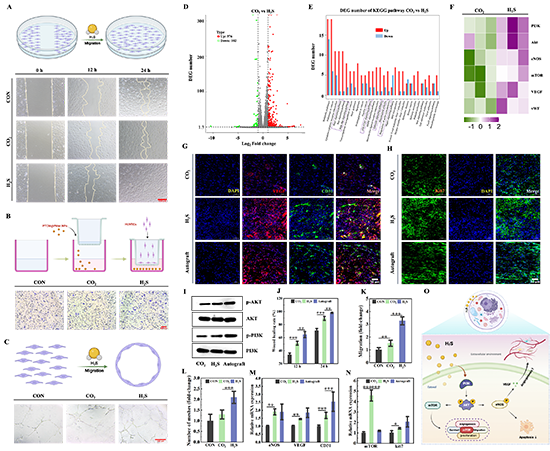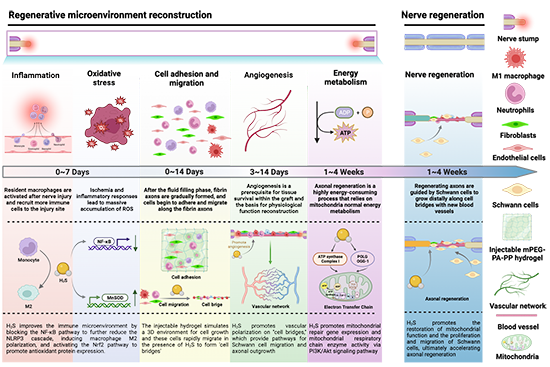 H2S促進(jìn)神經(jīng)再生機(jī)制:自適應(yīng)緩釋H2S的策略有效且動態(tài)調(diào)節(jié)了病灶部位的炎癥、氧化應(yīng)激、缺血和能量供應(yīng)不足問題,保護(hù)了受損神經(jīng)并加速移植物中再生微環(huán)境重塑。此外,可注射水凝膠形成的三維多孔結(jié)構(gòu)有助于神經(jīng)細(xì)胞的黏附、增殖和遷移以及“細(xì)胞橋”的形成,隨后H2S促進(jìn)橋上血管極化,從而為驅(qū)動軸突生長的SCs的遷移提供了路徑,加速神經(jīng)再生和功能恢復(fù)。