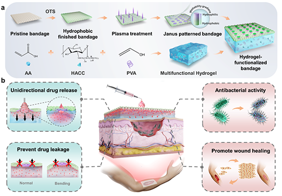 Hydrogel-functionalized bandages with Janus wettability for efficient unidirectional drug delivery and wound care