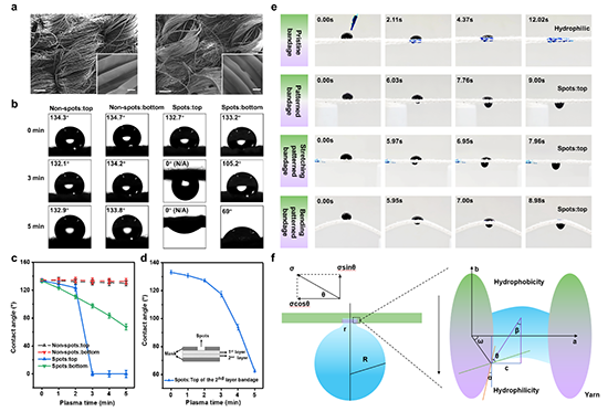 圖2. Janus圖案繃帶的物理特性和單向流體輸運行為。