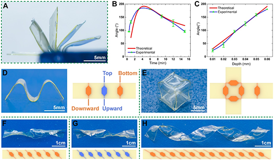 將二維材料編程為三維結構,由于能兼顧二維狀態下易于生產與儲存的特性,以及三維狀態下豐富的結構與功能,正在引發越來越大的關注。但以往的編程策略一般都需利用3D打印、數字光處理等復雜設備與高度定制化的方法,一定程度上阻礙了這項技術的普及。因此,開發出一種組件易于生產,且能避免使用圖案化刺激源進行形狀編程的方法,將能夠大大加速這項技術的應用。