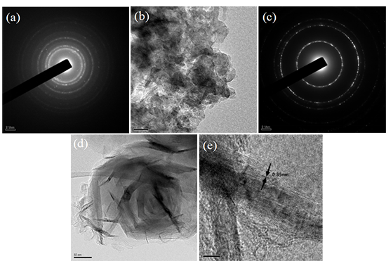 1 纖維的HRTEM圖像:(a)預(yù)氧化纖維的選區(qū)電子衍射圖像;(b)預(yù)氧化的低倍圖像;(c)900-9纖維的選區(qū)電子衍射圖像;(d)900-9纖維的低倍圖像;(e)900-9纖維的高倍圖像。