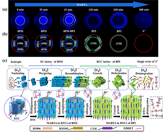 藍相液晶是一種具有獨特自組裝結構的“超材料”,也被視為三維光子晶體,具有無與倫比的光學特性和多刺激響應特性,在防偽、傳感、顯示、激光等領域有巨大的應用前景。藍相一般存在于各向同性相和手性向列相之間狹窄的溫度范圍內,一般采用降溫誘導液晶分子自組裝獲得。但是,藍相液晶又是一個典型的多組分熱力學系統,具有粘度高、熱導率低和內部相互作用復雜的特點,在自組裝過程中,不可避免地會產生晶格畸變扭曲,從而增強光散射,降低BP器件的響應特性。