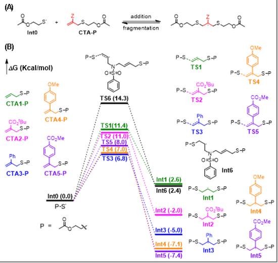 近年來,中山大學材料科學與工程學院黃漢初課題組圍繞“如何實現硫自由基的可控聚合”這一重要科學問題開展研究。前期他們通過異腈當場將鏈增長的硫自由基轉化成可被RAFT鏈轉移劑調控的烷基自由基,間接地解決了硫自由基的可控問題,但科學研究終究要劍指核心問題。因此,在這些前期工作的基礎積累上,他們已經意識到烯丙基硫化合物有望作為鏈轉移劑(CTA),直接可逆失活硫自由基,從而發展新的可逆硫自由基加成-斷裂鏈轉移聚合策略,即Reversible Thiyl Radical Addition-Fragmentation Chain Transfer (SRAFT)聚合策略(圖1B)。如機理所示,鏈增長的硫自由基加成到烯丙基硫的雙鍵上,然后發生β-斷裂,生成休眠聚合物和新的鏈增長硫自由基,從而在活性種和休眠種之間建立快速平衡,為所有鏈的增長提供平等的機會,最終生成分子量可控、末端保留度高的聚合物。