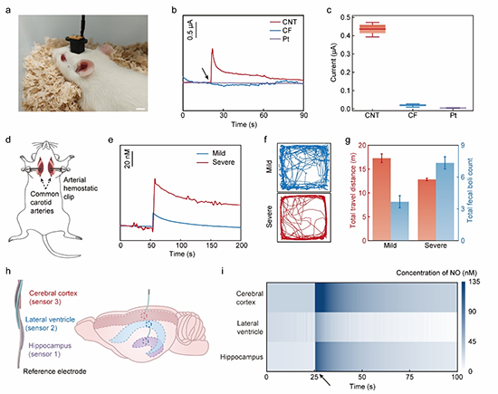 通過將基于羧基化碳納米管纖維傳感器植入到大叔腦部,成功實現了在外界刺激下對皮層NO的濃度檢測(圖5a-c)。隨后我們通過夾閉頸動脈構建腦卒中疾病模型,并成功檢測到了在輕型和重型腦卒中下大鼠皮層的NO濃度變化(圖5d,e)。在重型腦卒中下,NO濃度變化更大,與大鼠的行為學變化相對應(圖5f,g)。通過在軸向空間上排列傳感器的傳感位點可以實現對大鼠不同腦區的同時檢測,在腦卒中疾病模型中,皮層產生了濃度最高的NO,其次是海馬體,最后使側腦室(圖5h,i)。這是由于皮層中一氧化氮合酶數量較高,在中風條件下能夠迅速產生大量的NO。海馬體中的一氧化氮合酶相較于皮層較少,而側腦室中不存在表達一氧化氮合酶的細胞,NO只能從附近的腦區擴散到側腦室。這些結果與文獻報道的結果一致,驗證了傳感器實時監測的準確性。