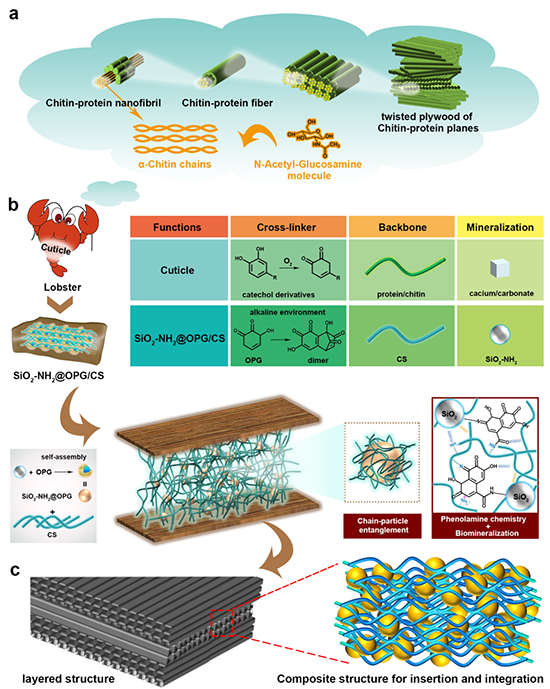 膠黏劑在日常生活和工業(yè)中有著廣泛的應(yīng)用,傳統(tǒng)的樹(shù)脂膠黏劑通常依賴于石油資源,原料不可再生,且易導(dǎo)致環(huán)境污染和人類健康等問(wèn)題。尋找高性能、可持續(xù)的木材膠黏劑替代品對(duì)于推動(dòng)木材工業(yè)發(fā)展具有重要意義。研究人員已經(jīng)對(duì)淀粉、纖維素、半纖維素、殼聚糖等多糖粘合劑進(jìn)行了各種策略的評(píng)估,包括結(jié)構(gòu)修飾、交聯(lián)劑修飾以及納米雜化增強(qiáng)和共價(jià)/非共價(jià)交聯(lián)。然而,大多數(shù)多糖類粘合劑自身的膠合性能較差。此外,常見(jiàn)的多糖基木材粘合劑通常包含復(fù)雜的物理和化學(xué)修飾。海洋節(jié)肢動(dòng)物外骨骼通常表現(xiàn)出卓越的強(qiáng)度和韌性,其中一個(gè)重要的設(shè)計(jì)原則歸因于它們獨(dú)特的扭曲膠合板結(jié)構(gòu),即從分子尺度上獨(dú)特的鞣化作用及礦化機(jī)制到微觀逐漸旋轉(zhuǎn)的平面分層排列結(jié)構(gòu)的疊加。因此,基于仿生學(xué)設(shè)計(jì)制造具有多層級(jí)微相有序結(jié)構(gòu)的生物基膠黏劑具有重要研究?jī)r(jià)值且當(dāng)前仍面臨挑戰(zhàn)。