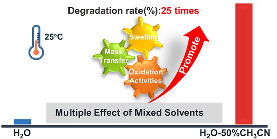 隨著電子電器、汽車飛機及風電葉片的大量退役,迫切需要開發熱固性樹脂的回收利用技術。但由于樹脂密的三維交聯網絡結構,反應需要在苛刻的條件下進行,選擇性差,降解產物復雜,利用率低團隊利用混合溶劑效應實現了環氧樹脂的溫和氧化降解(Green Chemistry2023, 25, 14: 5566-5574)。研究發現,當以乙腈(CAN)和水作為混合溶劑,硝酸鈰銨作為氧化劑,在室溫下即可實現熱固性樹脂的完全降解,相較于單一溶劑降解率提升25倍,且無需進行溶脹預處理。這一發現打破了熱固性樹脂降解反應需要在苛刻條件下進行的規律。混合溶劑對環氧樹脂氧化降解具有多重促進作用包括促進樹脂溶脹強化傳質,提高氧化劑的氧化性以及增強氧化劑的溶解性樹脂在混合溶劑體系中的溶脹行為與單一溶劑體系有很大不同,溶脹規律與溶解度參數不能很好匹配,主要受有機溶劑與樹脂,以及水與有機溶劑相互作用能的影響該研究對于開發熱固性樹脂的高效降解體系具有很好的借鑒作用,也為混合溶劑效應研究提供了新的視角。
