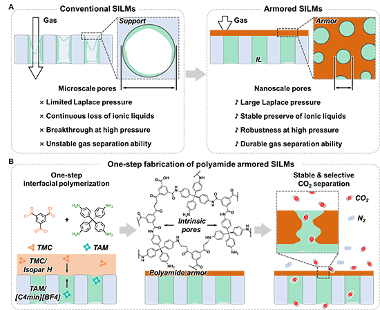 圖1. 裝甲離子液體支撐液膜的設(shè)計(jì)思路(A)和制備過程(B)。