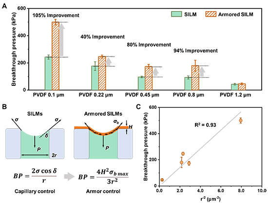 另一方面,裝甲離子液體支撐液膜具有優(yōu)秀的長期穩(wěn)定性。在長期測試中,常規(guī)支撐液膜僅運(yùn)行36 h即擊穿。而裝甲支撐液膜可以連續(xù)運(yùn)行超過150 h,其二氧化碳/氮?dú)饫碚摲蛛x比逐漸增加(圖3 A和B)。裝甲離子液體支撐液膜的穩(wěn)定運(yùn)行壓力超過先前報(bào)道的各類支撐液膜(圖3 C)。同時(shí),其長期運(yùn)行時(shí)的CO2/N2氣體分離性能也超過先前報(bào)道的以四氟硼酸鹽形成的離子液體支撐液膜材料(圖3 D)。