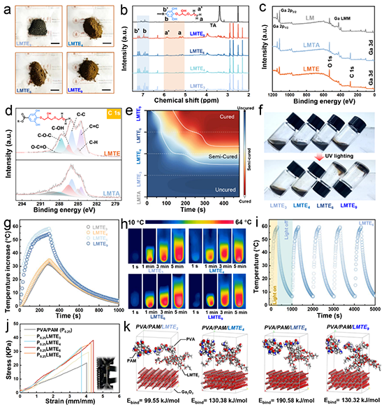 圖2.液態金屬光熱復合納米材料(LMTEi)微相結構、光交聯/光熱性能、及其界面結合能分析表征。
