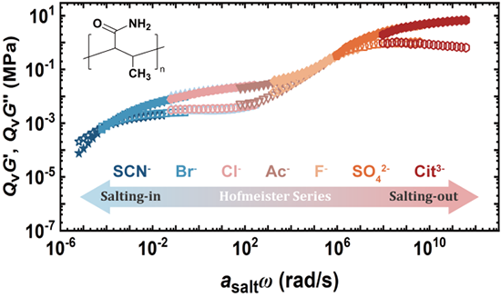 在水凝膠體系引入鹽離子是提升材料力、電、熱等性能的有效手段。Hofmeister效應是指大分子在水中的溶解能力隨著外加鹽的類型發生變化的現象。基于Hofmeister效應的功能水凝膠的設計成為了當前水凝膠領域研究熱點。然而,基于Hofmeister效應的水凝膠的粘彈性調控的研究尚不多見。寧波大學趙傳壯課題組近期將Hofmeister效應和高分子物理中經典的“時溫等效原理”結合起來,提出了“時鹽等效原理”,用以詮釋聚甲基丙烯酰胺(PMAm)水凝膠的粘彈性隨著外加鹽類型的劇烈轉變的現象 (圖1)。
