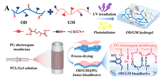 圖1. Janus生物粘合劑(OD/GM@PG)的制備流程與濕粘附示意圖