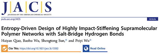 以上研究成果近期以“Entropy-Driven Design of Highly Impact-Stiffening Supramolecular Polymer Networks with Salt-Bridge Hydrogen Bonds”為題,發表在《Journal of the American Chemical Society》上(DOI: 10.1021/jacs.3c13392)。東華大學化學與化工學院博士研究生喬海燕為文章第一作者,孫勝童研究員和武培怡教授為論文共同通訊作者。