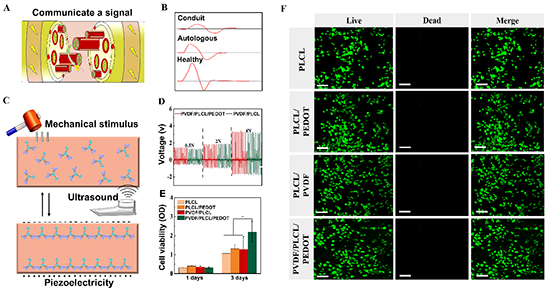 以PVDF、PLCL、PEDOT為材料,通過退火結晶以及相分離的制備工藝(圖2A)制備了PEDOT納米粒子分散均勻且具有微孔結構的PVDF/PLCL/PEDOT復合薄膜(圖2B)。該復合薄膜具有良好的力學性能(圖2C),最大拉伸應力可達15.4MPa,可伸長至681%以上(圖2D),能夠滿足在實際應用中耐縫合以及抗扭結的力學需求。復合膜的電導率達到6.99×10-7S/cm,可促進雪旺細胞髓鞘化(圖2E),同時退火結晶的工藝保留了PVDF的β壓電結晶相(圖2F-G),保證了其復合膜具有壓電性能。