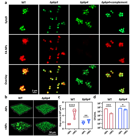 實驗研究進一步發現,FA NPs能夠有效破壞野生型(WT)USA300菌株的生物被膜,而對?pbp4菌株生物被膜無效。有趣的是,當菌株PBP4蛋白功能被恢復時,FA NPs對其生物被膜的破壞能力被恢復,證實了PBP4在介導外源性FA NPs插入葡萄球菌的肽聚糖中起著關鍵作用,從而破壞了EPS的結構完整性,最終導致生物被膜的分解。