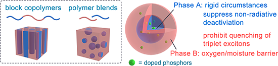 純有機(jī)室溫磷光高分子在應(yīng)急照明、防偽、顯示等領(lǐng)域有著廣闊的應(yīng)用潛力。最早關(guān)于有機(jī)染料摻雜高分子中產(chǎn)生室溫磷光的報(bào)道可以追溯到上世紀(jì)60年代。但是,對(duì)室溫磷光高分子的研究更多地聚焦于小分子染料(磷光體),而對(duì)于高分子基質(zhì)的關(guān)注十分有限。目前,大量相關(guān)研究集中在少數(shù)種類的均聚物中,如PMMA和PVA等。但在實(shí)際情況中,高分子往往是以“非均相”的狀態(tài)出現(xiàn)在真實(shí)的材料中,例如共混物、共聚物、復(fù)合材料等。“非均相”高分子基質(zhì)中室溫磷光的產(chǎn)生與高分子微觀聚集結(jié)構(gòu)之間的關(guān)聯(lián)鮮有研究。