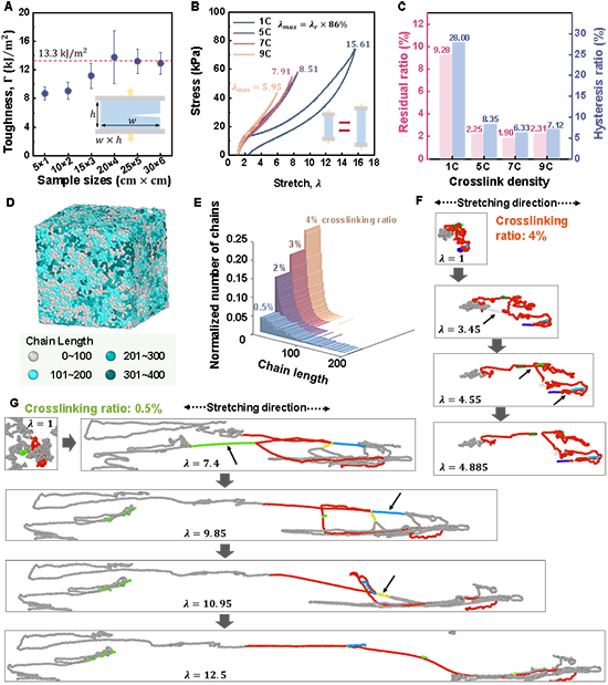 缺陷不敏感特性與內聚斷裂長度密切相關。內聚斷裂長度是指斷裂韌性與斷裂功的比值。通過對不同尺寸樣品進行“純剪”斷裂韌性測試,可得到HFI水凝膠的斷裂韌性為13.3 kJ/m2(圖3a)。該材料超高的斷裂韌性與缺陷不敏感性源于非彈性裂紋鈍化現象以及由此引起的裂紋尖端應力去集中。HFI水凝膠相對于常規水凝膠的高滯回與高殘余應變證明了HFI水凝膠中的非彈性變形行為(圖3b與3c)。CGMD模擬從微觀層面揭示了HFI水凝膠的高度非均勻網絡結構及其非彈性變形行為的微觀機制(圖3d-3g)。