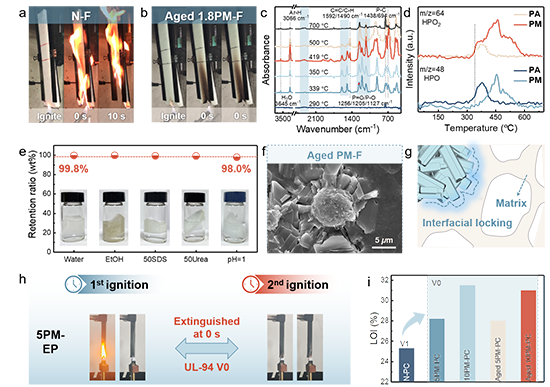 近日,四川大學王玉忠院士/趙海波教授團隊基于可逆界面互鎖策略構建了一種具有高阻燃普適性、長效耐久性且可反復化學循環的微米籠狀阻燃劑。利用含磷酸與過渡金屬間多重高度協同的相互作用驅動納米片宏觀自組裝,形成具有鋸齒狀多孔表面結構的籠狀粒子(PM),其可通過pH刺激組裝網絡的可逆失穩和動態重構,實現從高分子基體中的高效分離、再生和循環利用,而完整保留的高分子基體則可通過傳統的化學回收方法進行回收利用,從而避免阻燃劑存在對其化學降解效率、回收產物純度和再生材料性能的負面影響(圖1)。與現有的可回收阻燃體系不同,通過化學回收可以獲得初始原料單體(含磷酸與過渡金屬離子),其可通過化學重構以適應其它不同領域的差異化應用需求。此外,PM鋸齒狀的表面結構提供了額外的孔隙和接觸面積,高分子基體向內滲透并與其形成緊密的界面互鎖,賦予其苛刻環境下的長效耐久性,適用于多種熱塑/熱固性高分子材料(如聚氨酯、聚碳酸脂、環氧樹脂等)火安全性的大幅提高。