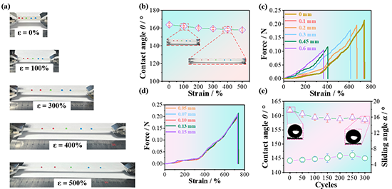 以硫化天然乳膠為原材料,通過簡單的模具復制成型技術制備了一種具有優異拉伸性能的超疏水超彈性薄膜。探究了不同模具參數對薄膜脫模性能、微觀形貌、表面潤濕性的影響,通過一系列試驗對超疏水超彈性薄膜的力學性能和穩定性進行了測試。同時,將超疏水超彈性薄膜與電磁系統結合,增強和擴展了雨滴能量的收集和轉化功能,為可再生能源的開發和利用創造了新的機會。