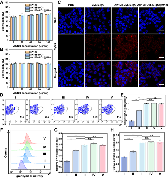 3.(A-B)不同材料處理24 h后的C6細胞和bend.3細胞的活力測定。(C) 激光共聚焦顯微鏡觀察巨噬細胞對不同材料的攝取情況。(D-E)不同材料處理PBMCs后NK細胞比例的代表性流式細胞術圖和定量分析圖。不同材料處理后(F)顆粒酶B的熒光強度直方圖,(G)IFN-γ和(H)穿孔素的表達分泌測定。(D-H):Ⅰ,PBS;Ⅱ- 2;Ⅲ,Il-2 + AK128;Ⅳ,IL-2 + AK128-aPD1;V,IL-2 + AK128-aPD1@M1m。