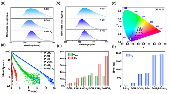 近期,華東理工大學馬驤教授團隊通過將苯甲酸甲酯衍生物摻雜到聚乙烯醇基質中,實現了超寬范圍壽命可調的高效持久深藍色室溫磷光材料(圖1)。研究表明,隨著苯甲酸甲酯對位取代基給電子能力的不斷增強,摻雜薄膜的磷光壽命可以從32.8 ms (P-CH3)提高到1925.8 ms (P-NHCH3),實現了超寬的調節范圍。此外, 4-羥基苯甲酸甲酯、4-氨基苯甲酸甲酯和4-氨甲基苯甲酸甲酯摻雜薄膜的磷光發射位于深藍色區域,磷光量子產率最高達15.4%,這拓寬了其在有機光電信息領域的應用范圍。理論研究表明,取代基的給電子能力能夠調節苯甲酸甲酯衍生物的HOMO-LUMO和單線態-三線態能隙,以及與聚乙烯醇之間的非共價相互作用能力。能隙越小,它們之間的相互作用力越強,越有利于產生長壽命室溫磷光。這項工作為開發超寬范圍可調諧壽命和高效持久深藍色室溫磷光材料提供了一種簡便的策略。