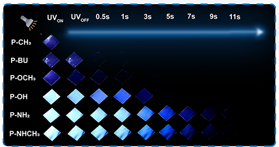 為了實現寬范圍壽命可調的深藍色室溫磷光,研究團隊選擇了六種苯甲酸甲酯衍生物4-甲基苯甲酸甲酯、4-叔丁基苯甲酸甲酯、4-羥基苯甲酸甲酯、4-甲氧基苯甲酸甲酯、4-氨基苯甲酸甲酯和4-苯甲酸氨基甲酯,將它們摻入到聚乙烯醇基質中,發現在關閉紫外光后,所制備的摻雜薄膜均具有藍色余輝,其中P-NH2P-NHCH3的余輝長達十多秒(圖3)。在薄膜的延遲光譜中,磷光發射峰出現在400 nm450 nm之間(圖2a2b)。通過CIE坐標圖(圖2c)可以觀察到P-OHP-NH2P-NHCH3都位于深藍色區域,而P-CH3P-BUP-OCH3則位于藍色區域,這也和它們的余輝照片一致。重要的是,摻雜薄膜的壽命直方圖(圖2e)顯示這些摻雜薄膜的磷光壽命呈現持續增加趨勢,從P-CH332.8 ms提高到P-OH796.8 ms,然后到P-NHCH31925.8 ms。此外,它們的量子產率直方圖(圖2f)也顯示出上升趨勢,光致發光量子產率從3.9%增加到44%,磷光量子產率從3.2%增加到14.4%