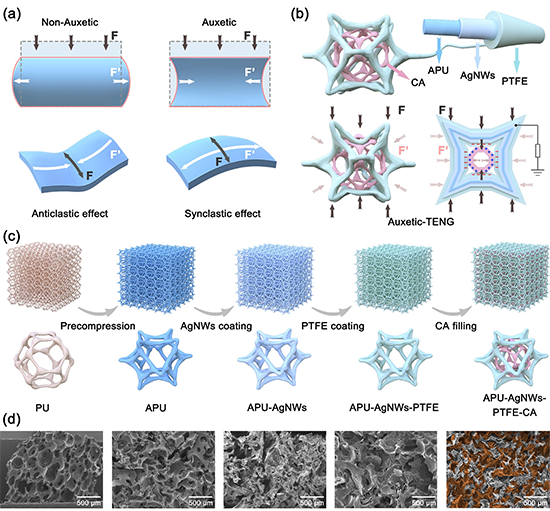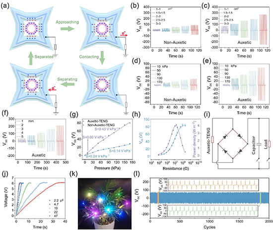 在本研究中,在預壓縮后的負泊松比聚氨酯框架上包覆聚四氟乙烯負摩擦層,內嵌正泊松比的天然膠原聚集體泡沫正摩擦材料,構建整體為負泊松比特性的Auxetic-TENG。該制備策略利用了在外界壓力下負泊松比超材料的收縮形變和內部正泊松比膠原聚集體的膨脹特性,顯著增加外力作用下Auxetic-TENG的接觸面積及機械能吸收并轉化為電能的效率。經過測試,Auxtic -TENG的開路電壓與傳統的接觸分離TENG相比提高了4倍,功率密度達到4.2 W m?2。應用實驗表明在各種壓縮比和應力條件下,Auxetic-TENG可以保持優越的靈敏性和耐用性,突出其作為可穿戴自供電傳感器用于綜合醫療保健的潛力。