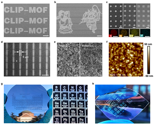 圖3展示了在剛性和柔性基底上制備微米尺度的ZIF-8圖案,包括字母、像素陣列和復雜圖案。所使用的ZIF-8 NPs表面為BrijC10配體(簡寫為ZIF-8@BrijC10)。電子能譜(EDS)確認了微點圖案由交聯的ZIF-8組成,其中ZnF分別來自ZIF-8和交聯劑(圖3c)。放大的SEMAFM圖像顯示出致密MOFs圖案薄膜,表面粗糙度約為13 nm,與未圖案化的ZIF-8@BrijC10膜相似(圖3e, f)。此外,CLIP-MOF實現大面積基底(如4英寸硅片)的圖案化,如圖3g所展示的元素周期表圖案。CLIP-MOF也適用于任意基底(硅晶圓、玻璃、金屬、導電氧化物等),包括柔性可彎曲基底等(圖3h