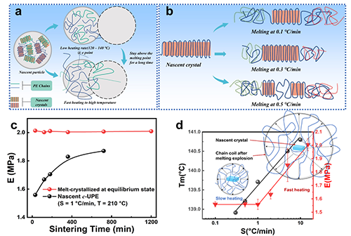 針對上述問題,鄭州大學陳靜波教授課題組通過控制初生商用超高分子量聚乙烯(c-UPE)和低纏結超高分子量聚乙烯(l-UPE)在燒結過程中的加熱速率(S)和溫度(T),實現熔融過程的控制,使得熔體具有不同程度的纏結。同時,研究了熔融行為與鏈纏結之間的關系,以及熔融過程中纏結的變化機制。利用超高分子量聚乙烯(UHMWPE)在熔點以上仍保持高彈態,力學性能完全依賴于纏結網絡的特性,采用了熔點以上拉伸實驗的彈性模量來表征鏈纏結度。結果顯示,實驗成功制備了纏結度較低的制品,并且實現了制品纏結度的較大范圍調控。