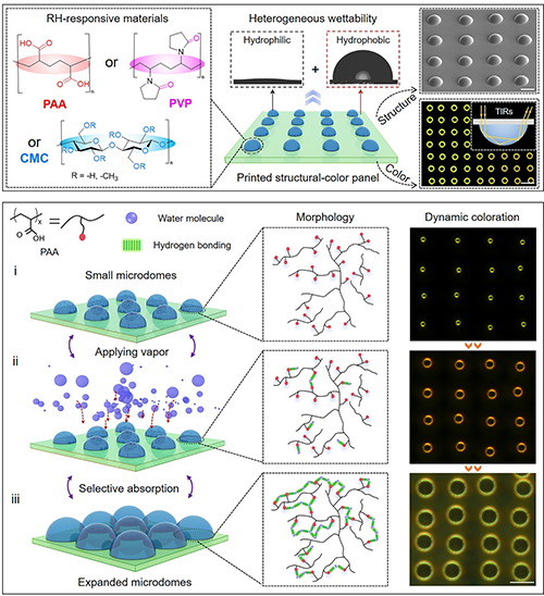 近日,中國科學(xué)院化學(xué)所宋延林、李會(huì)增團(tuán)隊(duì)設(shè)計(jì)并提出了表面張力驅(qū)動(dòng)的濕度響應(yīng)性全內(nèi)反射微穹頂結(jié)構(gòu),該結(jié)構(gòu)可通過噴墨打印直接制備并能實(shí)現(xiàn)出單像素可調(diào)的結(jié)構(gòu)色圖案。研究人員發(fā)現(xiàn),該結(jié)構(gòu)色可在不同尺寸下展現(xiàn)出不同的響應(yīng)敏感性,基于此,他們打印了集成化的結(jié)構(gòu)色加密圖案,實(shí)現(xiàn)了濕度響應(yīng)加密圖案的多路復(fù)用,并結(jié)合計(jì)算機(jī)圖像識別算法,對加密信息進(jìn)行快速可靠的自主讀取。同時(shí),研究人員還通過控制環(huán)境溫度與響應(yīng)濕度,實(shí)現(xiàn)了結(jié)構(gòu)色像素點(diǎn)的可控融并,從而能夠控制加密信息的選擇性“閱后即焚”,因此顯著提升了加密信息的安全性與可設(shè)計(jì)性,為智能結(jié)構(gòu)色加密材料的設(shè)計(jì)與應(yīng)用開辟了新路徑。相關(guān)工作以“Dynamic high-capacity structural-color encryption via inkjet printing and image recognition”發(fā)表在《Advanced Functional Materials》上。