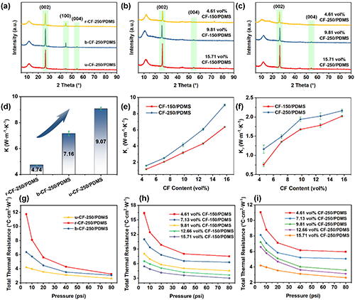 圖3 CF/PDMS復合材料的XRD譜圖、導熱系數和總熱阻