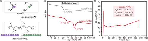 最后,作者將同樣的反應策略用在rac-PTL聚合反應(圖5),得到了分子量高達276 kDa,D =1.22的等規P(PTL)。通過DSC測試發現等規P(PTL)為半結晶材料,其熔點為75 ℃。作者進一步研究了它的力學性能。應變-應力曲線表明,等規P(PTL)是一種韌性較好的材料,其屈服抗拉強度為27.5±2.8 MPa,斷裂抗拉強度為14.4±3.4 MPa,斷裂伸長率為588±49%。