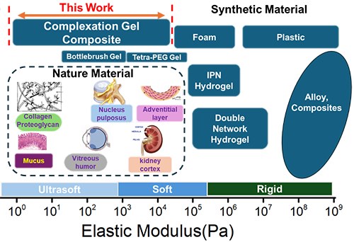 在帶電復合水凝膠體系中,聚陽離子鏈作為客體,帶負電荷的凝膠網絡作為主體,通過改變聚陽離子鏈尺寸與凝膠網格尺寸之比、摩爾電荷比和溶脹方法,來精確調控帶電復合水凝膠體系的拓撲結構與主客體之間的物理相互作用力,從而實現準互穿復合凝膠網絡,排斥型復合凝膠、離子鍵主導的物理復合凝膠等結構轉變。基于此,他們建立了一個簡易黏彈智庫,實現了在水環境中帶電復合水凝膠的彈性模量和黏性在超軟區—軟區域的同時定量調控,從“堅韌”凝膠到“超軟”凝膠,從低阻尼的“彈性”凝膠到高阻尼的“黏性”凝膠。這一研究成果為仿生具有不同黏彈性質與模量的生物軟組織與生物材料提供了重要的物理基礎。