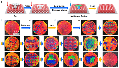 力致色變光子晶體因具有通過外力改變結(jié)構(gòu)色的特性受到廣泛關(guān)注。然而,撤去外力后,力致色變結(jié)構(gòu)色迅速恢復(fù)且難以記錄,限制了其應(yīng)用拓展。近日,紹興文理學(xué)院化學(xué)化工學(xué)院楊東朋博士與國科大杭州高等研究院黃少銘教授合作,通過結(jié)合非密堆積力致色變光子晶體和相變材料,制備了一種具有熱開-關(guān)特性和多色記錄-擦除功能的新型力致色變光子晶體紙張。通過在相變溫度以上擠壓光子晶體紙張獲得目標(biāo)結(jié)構(gòu)色,隨后冷卻至室溫記錄目標(biāo)結(jié)構(gòu)色。通過加熱擠壓后的光子晶體紙張,可對(duì)已記錄的結(jié)構(gòu)色進(jìn)行擦除。基于上述特性,作者發(fā)展了基于光子晶體紙張的新型多色、高分辨無油墨印刷術(shù),實(shí)現(xiàn)了對(duì)同一紙張重復(fù)擦寫(圖1)。該新型光子晶體紙張的發(fā)展和大范圍使用將有助于減少環(huán)境污染、一次性油墨和紙張的使用。