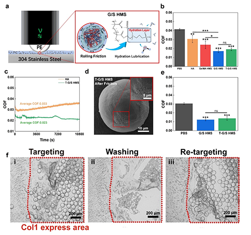 T-G/S HMS的靶向能力得益于表面修飾的抗I型膠原蛋白抗體(圖2)。在體外實(shí)驗(yàn)中,該微球能夠顯著聚集于表達(dá)I型膠原蛋白的軟骨損傷區(qū)域,展現(xiàn)出極高的特異性靶向能力。GelMA/PSBMA復(fù)合微球具有良好的親水性,能夠形成穩(wěn)定的水合層,顯著減少摩擦系數(shù)。研究表明,T-G/S HMS的摩擦系數(shù)(COF)低至0.020,比標(biāo)準(zhǔn)生理鹽水(PBS)的COF(0.041)降低了51.2%。。通過(guò)長(zhǎng)時(shí)間摩擦測(cè)試,T-G/S HMS的摩擦系數(shù)至少在連續(xù)3小時(shí)摩擦?xí)r保持穩(wěn)定,表現(xiàn)出優(yōu)異的潤(rùn)滑性能和耐久性,相比傳統(tǒng)的透明質(zhì)酸(HA)溶液,T-G/S HMS的摩擦系數(shù)降低30.3%,表現(xiàn)出更優(yōu)異的潤(rùn)滑效果。并且,反復(fù)靶向?qū)嶒?yàn)驗(yàn)證,即使T-G/S HMS在摩擦過(guò)程中因剪切力脫靶,其也可重新靶向至損傷區(qū)域,進(jìn)而保證了長(zhǎng)時(shí)間的潤(rùn)滑和防護(hù)效果。