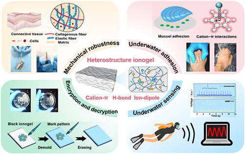 柔性離子導體在未來軟離子電子學領域具有重要的應用前景。然而,創造具有機械穩健性,水下粘附性和水下運動監測能力的柔性導體仍然存在挑戰。人體中存在各種軟組織,如皮膚、肌腱和韌帶,具有優異的機械強度、韌性和彈性,能夠承受數十至數百兆帕的應力載荷(例如,人類皮膚的抗拉強度為1~32 MPa)。這些天然組織中(結締組織)存在異質結構,如堅固的膠原纖維支架,低模量的彈性纖維和柔軟的富水基質等。