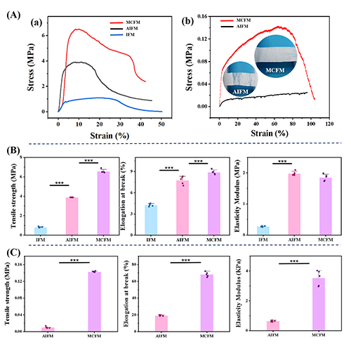 圖2。 PAPC IFM、AIFM 和 MCFM的力學性能分析。(A) a) 微米纖維取向平行方向上的拉伸曲線;b) AIFM 和 MCFM 在微米纖維取向垂直方向上的拉伸曲線和拉伸后的物理照片;IFM、AIFM 和 MCFM 在微米纖維取向(B)平行方向和(C)垂直方向上拉伸強度、斷裂伸長率和彈性模量。