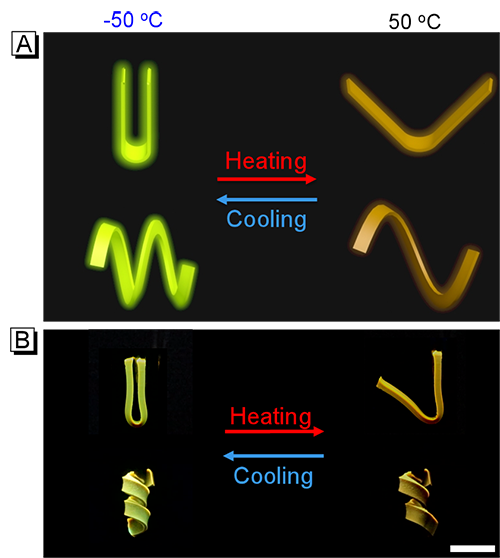 4TPE-EP1.5@PCL樣品在-50 °C50 °C下發光顏色、強度和形狀同時改變的示意圖(A)和圖片(B)。比例尺:1.0 cm