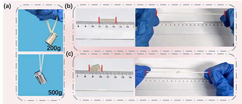 該研究中,作者分析了粘稠度提升劑NaCl和成孔劑CaCO3顆粒對水凝膠機械性能的影響(圖2),結果表明添加NaClCaCO3延長了水凝膠的固化時間,并提高了其整體穩定性,水凝膠的最大伸長率可達到2272.62%,應力達到52.81 kPa,對皮膚的粘合強度2.05 kPa,并且在完全垂直狀態下,仍可實現牢固黏附(圖3)。此外,少量的CaCO3溶解所釋放的Ca2+在水凝膠中形成動態離子鍵,使水凝膠在自愈合后機械伸長率仍可以達到原始伸長率的40%。由此可知,CaCO3作為成孔劑,在水凝膠內部成功搭建了水凝膠橋,所構建的多孔道支撐結構提高了離子傳輸性能,為水凝膠的自愈合性能提升提供了基礎。同時,NaCl作為粘稠度提升劑,在提升水凝膠黏附性方面起到了關鍵作用。
