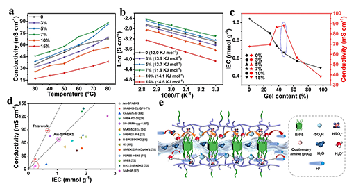 圖4. (a–c)質(zhì)子電導(dǎo)率、活化能曲線、IEC和質(zhì)子電導(dǎo)率隨凝膠含量的變化曲線,(d)本研究與文獻(xiàn)已報道的質(zhì)子電導(dǎo)率–IEC對比