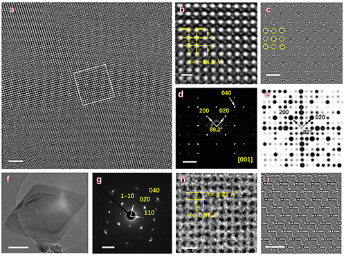 圖3.(a)SJTU-101沿[001]方向的像差校正HRTEM圖像。(b)(a)中選定區域的高倍顯微照片。(c)SJTU-101優化得到的結構沿[001]方向的模擬投影勢圖。SJTU-101沿[001]方向的SAED圖案(d)和模擬倒易晶格圖像(e)。(f)TEM圖像,(g)SJTU-102沿[001]方向的SAED 圖案。(h)SJTU-102的濾波TEM圖像和(i)模擬TEM圖像。比例尺:(a、b、c、f、h、i)10 nm、2 nm、2 nm、500 nm、2 nm、2 nm;(d、g) 1 nm?1。